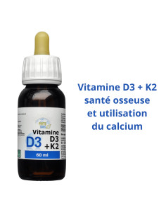 Cette forme liquide de vitamine D3 + K2 permet un apport de vitamine D tout en orientant son utilisation vers le squelette et les dents. En effet, la K2 a pour bienfait de maintenir et orienter le calcium vers les os et non les artères. Si vous souhaitez prendre de la vitamine D dans un but saisonnier, nous proposons la vitamine D3 seule et en gélules.